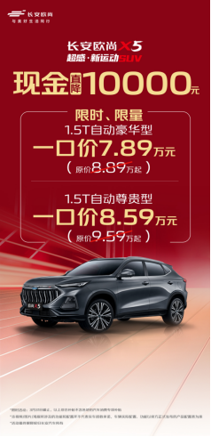 歐尚X5的1.5T自動(dòng)豪華型直降現(xiàn)金10000元,一口價(jià)7.89萬;歐尚X5的1.5T自動(dòng)尊貴型直降現(xiàn)金10000元,一口價(jià)8.59萬!