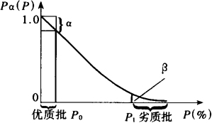 生產(chǎn)方風(fēng)險(xiǎn)如圖1中α。此時(shí),不合格率p0<AQL(合格質(zhì)量水平),檢驗(yàn)批應(yīng)判通過檢驗(yàn)。但由于OC曲線的特性,仍有一定風(fēng)險(xiǎn)被判為不通過檢驗(yàn)。風(fēng)險(xiǎn)值為α。