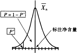 如果檢驗(yàn)批符合正態(tài)分布,而且平均凈含量等于標(biāo)注凈含量,可以判定這個(gè)檢驗(yàn)批通過平均凈含量的檢驗(yàn)。如果從以上檢驗(yàn)批中隨機(jī)抽取n個(gè)樣品,測定平均凈含量,重復(fù)這樣的檢驗(yàn)多次,可以得到如圖2的正態(tài)分布。該圖表明有50%的概率,抽取的n個(gè)樣品的平均凈含量會(huì)小于實(shí)際批凈含量。