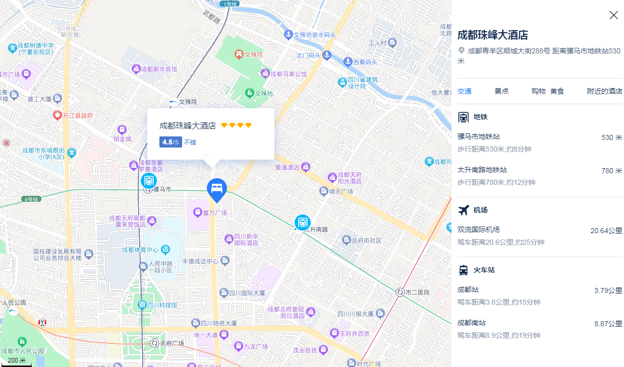 乘坐地鐵約29分鐘(4元),成都西站乘地鐵4號線(西河方向),在騾馬市站(E口)下車,步行770米即可到達(dá)酒店。乘坐出租車約40分鐘(約30元)。