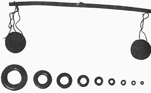 春秋時期,楚國制造有小型衡器——木衡、銅環(huán)權,用來稱黃金貨幣。完整的一套環(huán)權共十枚,分別為一銖、二銖、三銖、六銖、十二銖、一兩、二兩、四兩、八兩、一斤。一銖重0.69克,一兩重15.5克,一斤251.3克,十枚相加約500克,為楚制二斤。中國歷史博物館藏有一支戰(zhàn)國時銅衡桿,正中間有提紐和穿線孔,一面顯出貫通上下的十等分刻線。
