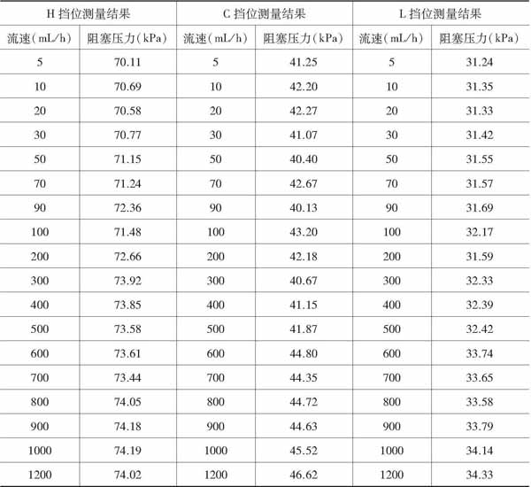 將注射泵質(zhì)量分析儀與被檢注射泵連接好后,注射泵設(shè)置為注射狀態(tài),檢測(cè)儀設(shè)置在測(cè)試阻塞報(bào)警狀態(tài),使注射泵注射受阻,產(chǎn)生相應(yīng)的聲光報(bào)警,并停機(jī),此時(shí)記錄檢測(cè)儀顯示的阻塞壓力。分別對(duì)注射泵的H、C、L三個(gè)阻塞壓力擋位正順應(yīng)性和逆順應(yīng)性進(jìn)行校準(zhǔn)。