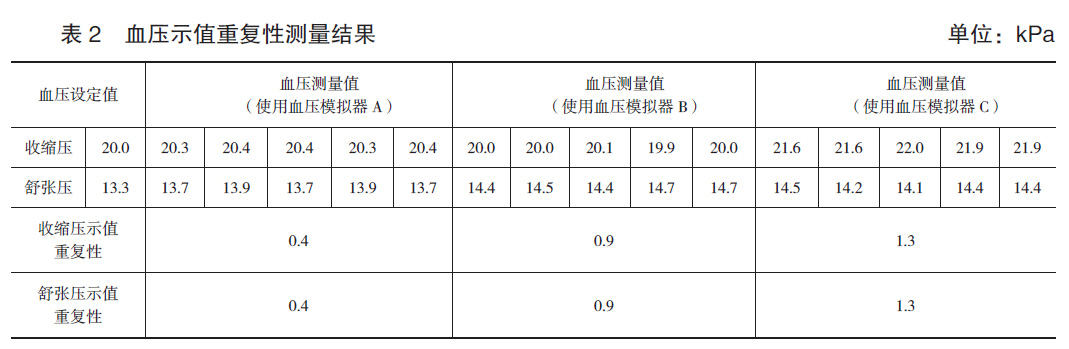 用膠管和三通把電子血壓計與袖帶、血壓模擬器連接,袖帶卷扎在相應(yīng)尺寸的硬質(zhì)金屬容器上,松緊適宜,血壓模擬器采用外置袖帶模式且設(shè)置成對收縮壓和舒張壓,由電子血壓計對血壓模擬器加壓測量,記錄電子血壓計顯示的收縮壓和舒張壓示值,測量結(jié)果如表2所示。