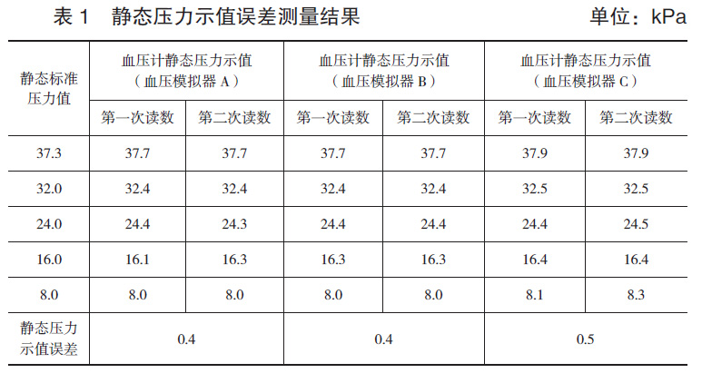 使用該型號電子血壓計的靜態(tài)壓力測量專用接頭,用膠管和三通把電子血壓計與金屬容器、標(biāo)準(zhǔn)器連接起來組成檢定系統(tǒng)。將電子血壓計調(diào)至靜態(tài)壓力測試模式,在電子血壓計規(guī)定的靜態(tài)壓力范圍內(nèi),標(biāo)準(zhǔn)器設(shè)定5個檢定點,由標(biāo)準(zhǔn)器對電子血壓計逐點從高到低降壓,重復(fù)進(jìn)行2次壓力測量,測量結(jié)果如表1所示。